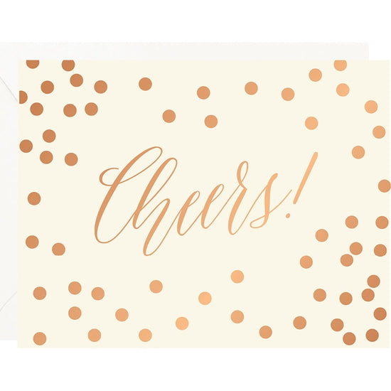 The card is decorated in gold foil and reads Cheers!, sprinkled in confetti. Card is blank inside and includes a white envelope.