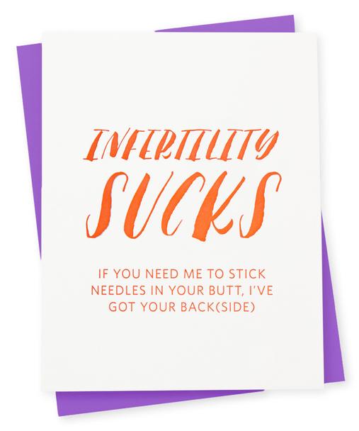 Card Reads: Infertility Sucks. If you need me to stick needles in your butt, I've got your backsides.