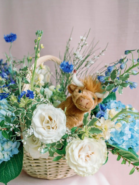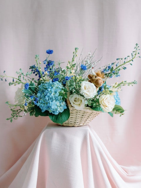 Our signature Mibellarosa Omakase takes on a new life in our Baguni, a gorgeous basket holding an array of blooms in your choice of our style options (stuffed animals, moon sign, and other gifts may be added onto the order a la cart, however, is not included in your order).